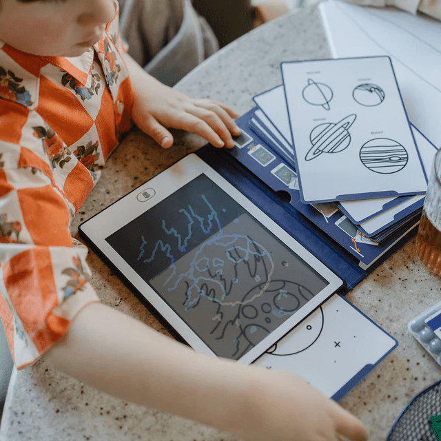 De tablet is gemaakt van stevig, duurzaam kunststof dat tegen een stootje kan en veilig is voor kinderen. Het heldere display zorgt voor scherpe lijnen, terwijl het eenvoudige wismechanisme direct een nieuw tekenoppervlak creëert. Geen gedoe meer met papier en stiften, maar een schone, herbruikbare tekenervaring die bijdraagt aan minder afval.